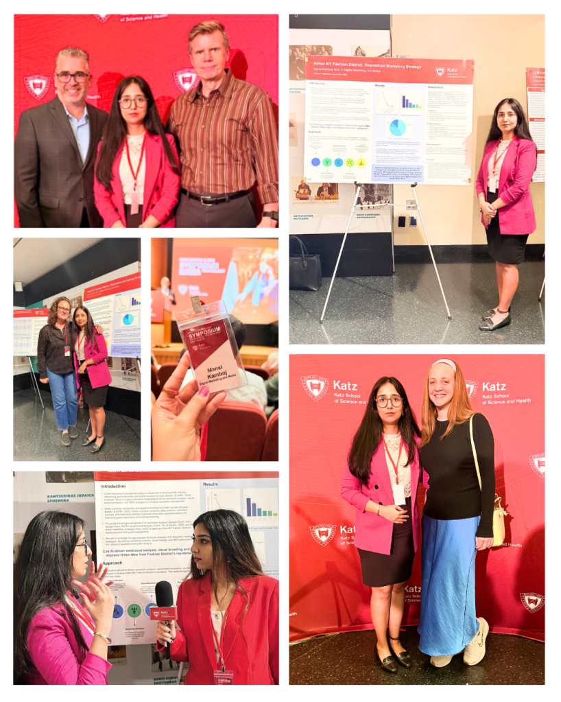 The poster focused on three core visuals — guest sentiment chart, image tag cloud from Google Vision, and online brand mentions pie chart — along with actionable insights and a strong research foundation.