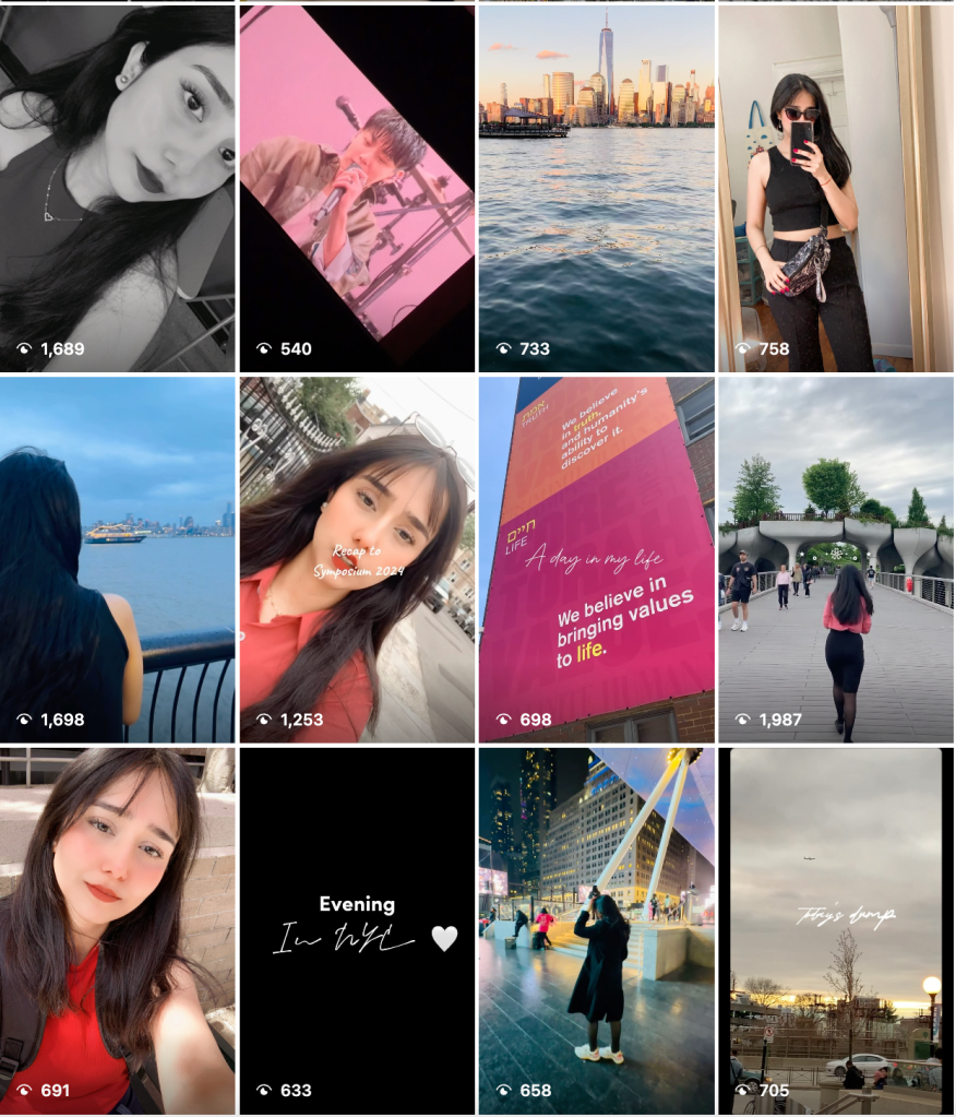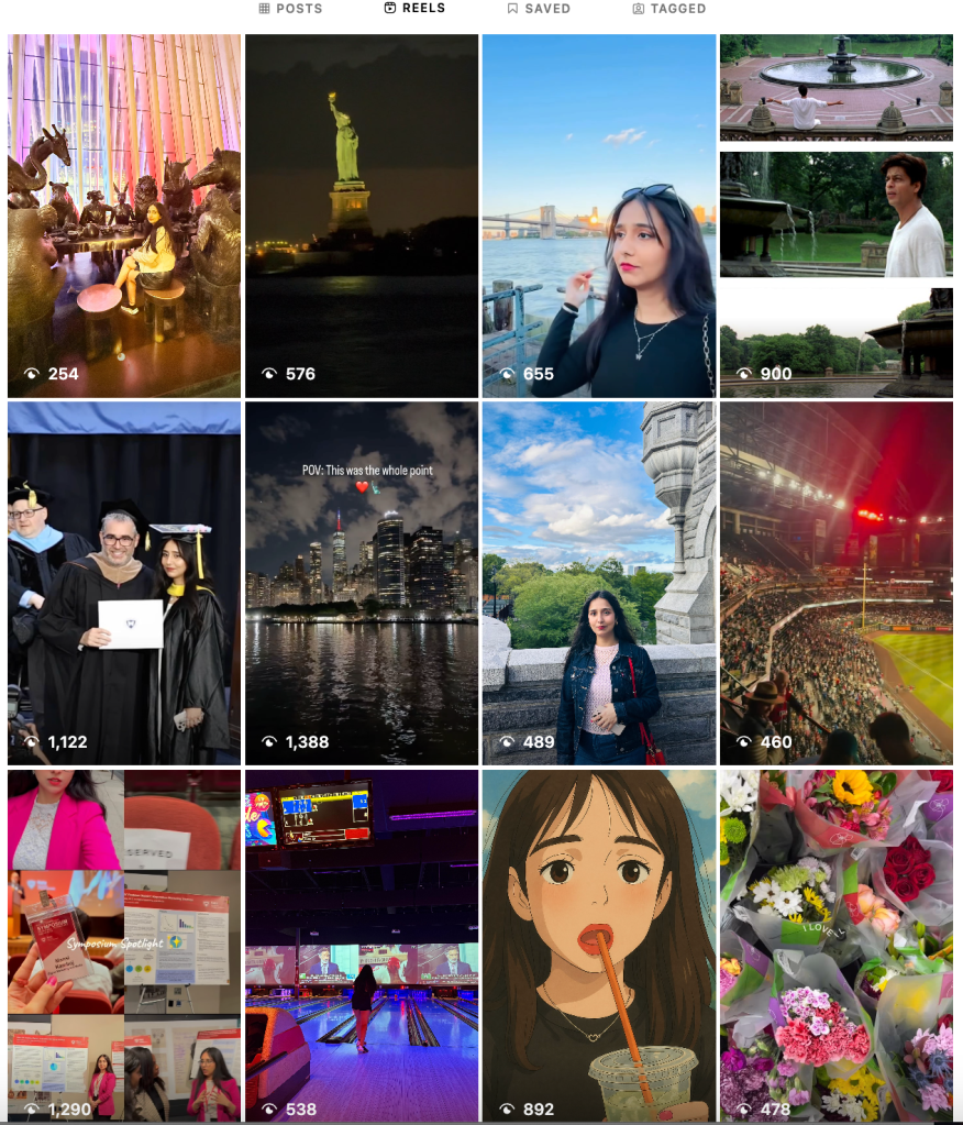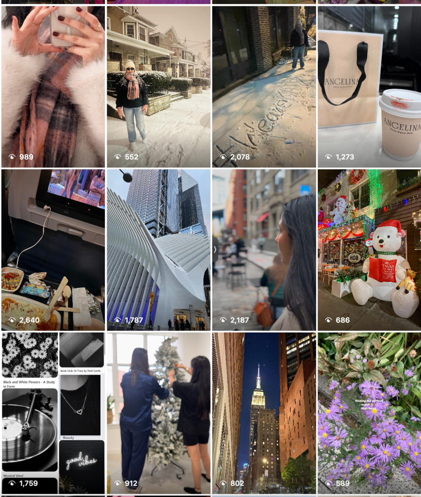 Here’s a visual snapshot of the Reels I’ve been experimenting with — from cozy moments to NYC walks and trend-based edits. These screenshots show what content styles got the most traction (and which didn’t), helping me better understand what my audience engages with.