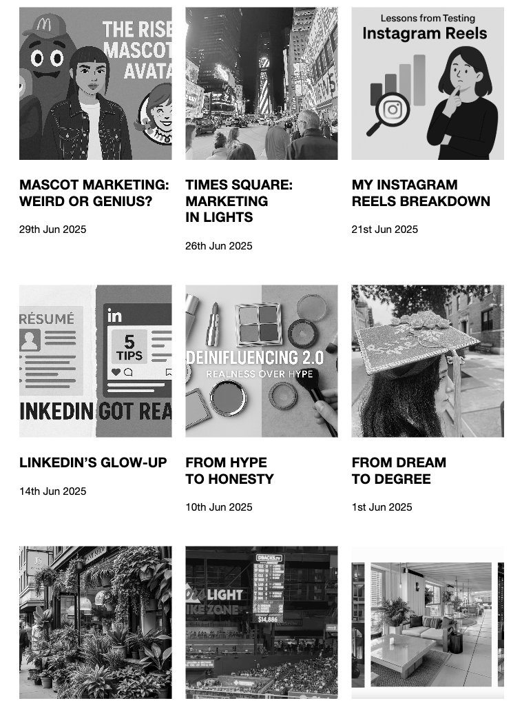 I started because I wanted a space where I could think out loud – where my ideas could live somewhere beyond my camera roll or class notes. And over time, it naturally evolved into something more: a personal archive of my growth, perspective, and passion for the world of marketing.