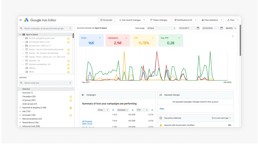 Screenshot of Google Ads Editor showing campaign overview, performance graphs, and editing tools. A look inside the Google Ads Editor dashboard, where you can manage thousands of ads offline and in bulk.