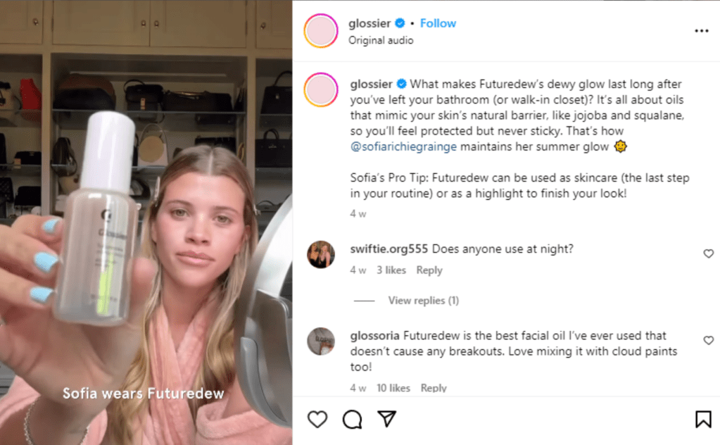 Glossier’s influencer strategy leans on authentic, personal recommendations from creators who feel like trusted friends, even at a smaller scale.